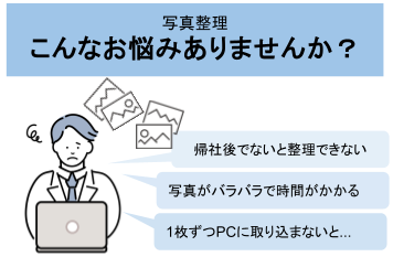 現場で撮影した写真を1枚ずつ手作業で登録・整理していたため、