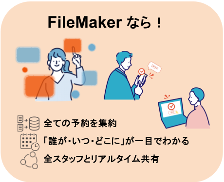 Web予約とFileMakerのカレンダーを連携。予約枠を一元管理し、空き状況を全拠点で共有。